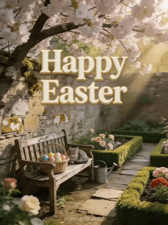 Discover these tender free Easter images with a grey cat in a spring garden with roses and cherry blossom. Discover also Happy Easter message or Happy Easter animated gif.