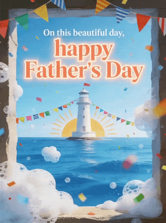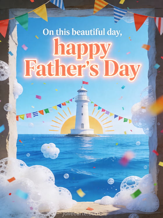 Send a free fathers day image with clean coral lettering, a white lighthouse above a bright blue sea, colorful flags, sun rays, sea foam and joyful confetti. Discover also a happy Father's Day card, a happy father's day my darling card or a card template for father's day.