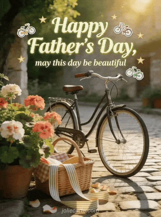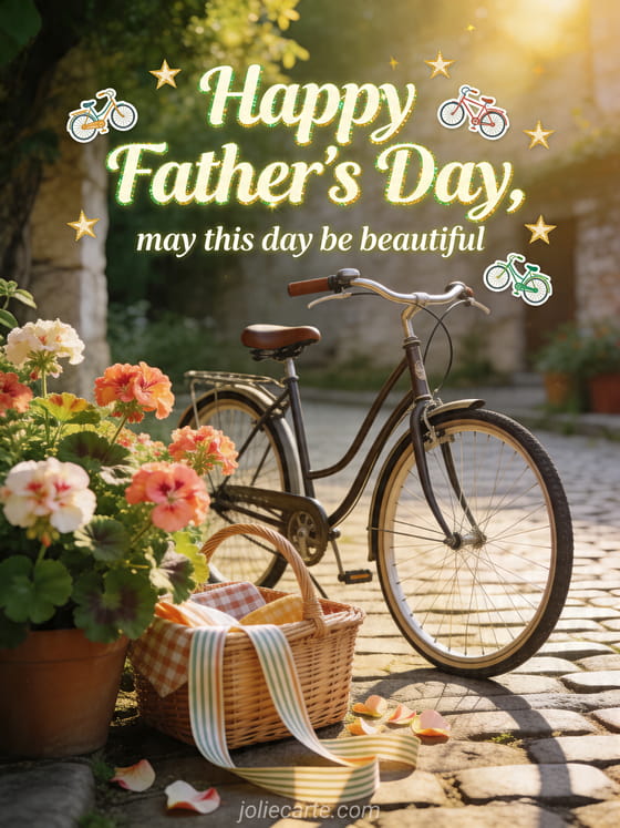 Share free Father's Day images with elegant cream script, tiny bicycle and star stickers, a vintage bicycle beside blooming geranium, a picnic basket, striped ribbon and sunlit cobblestones. Discover also happy Sunday Father's Day, a father's day shirt greeting card or dad's day cards.