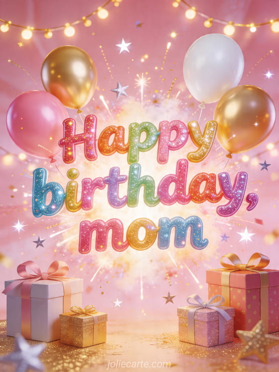 Send a joyful birthday wish to your mom with this festive card filled with pink, gold, and white balloons, wrapped gifts, glowing garlands, and confetti. Discover also happy birthday mom text, happy birthday mom card and mom birthday message.