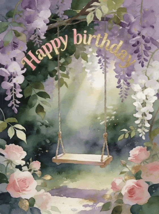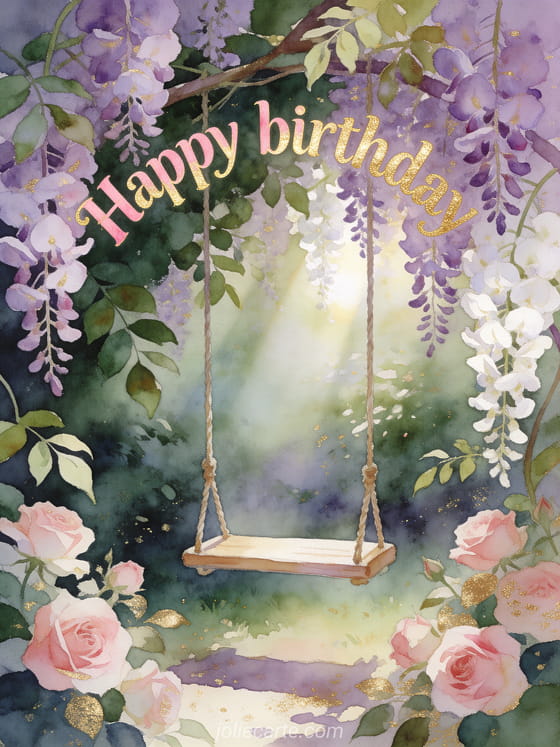 Share this dreamy birthday card with a hidden garden, a swing wrapped in wisteria, and a fairytale watercolor style. You can also browse gif humor birthday woman, happy birthday female text, and dromedary birthday card woman.