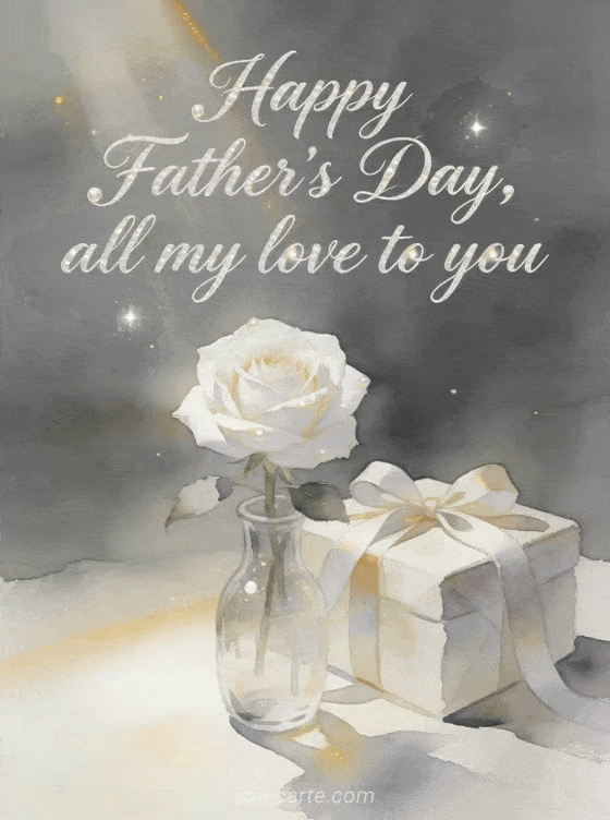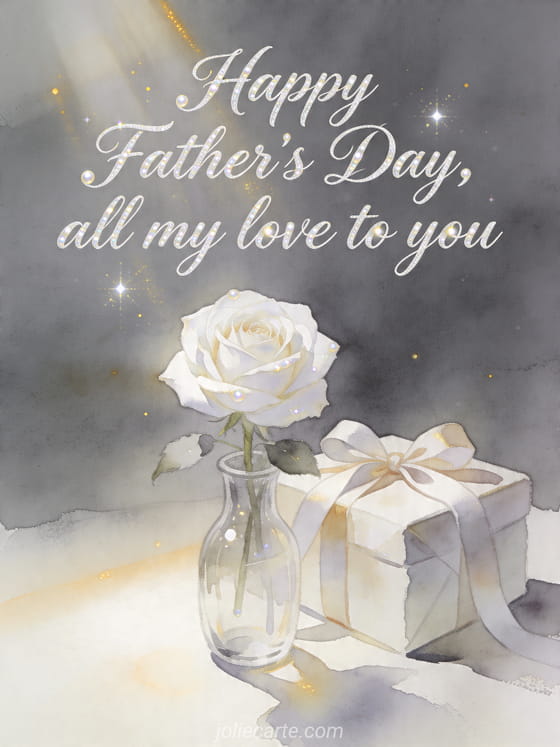 Share a luminous watercolor Father's Day card with a single white rose in a glass vase, a ribboned gift and golden sunbeams. This calm, tender design is perfect for sending all your love. Discover also the best father's day card, happy day to dad or a card for father's day.