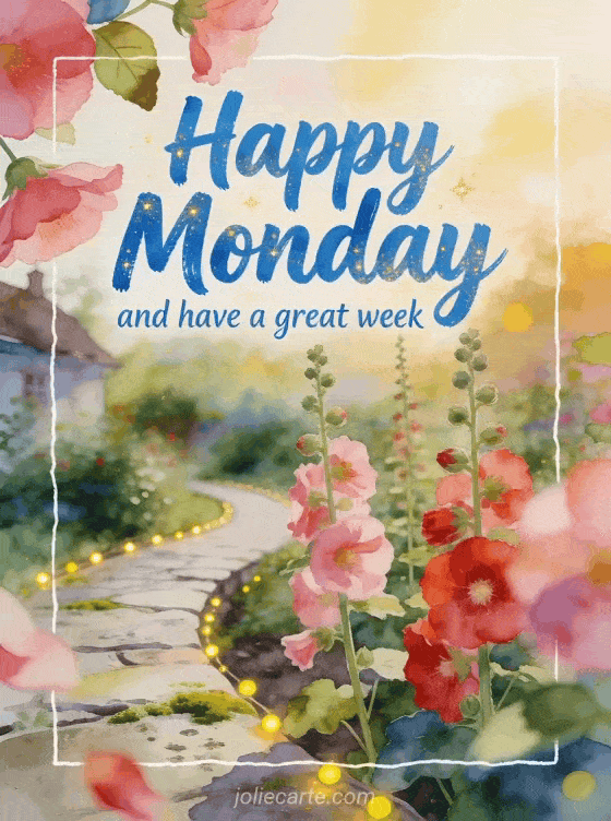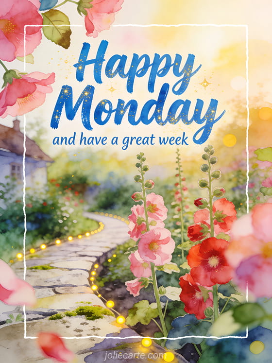 Share free happy monday and great week images with a bright watercolor cottage garden, tall hollyhocks and a curved stone path glowing in warm morning light. This joyful card brings color and energy to the start of the week, and you can also discover happy Monday everyone images, a happy monday woman image or a happy monday card.