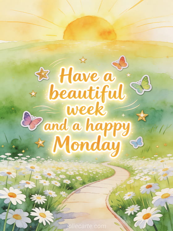 Send a beautiful week and happy Monday with a wide meadow of daisies, a curved path leading to a golden sunrise, colorful butterflies and stars. Discover also good morning happy monday have a good week kisses, good morning monday image or good week and happy Monday image.