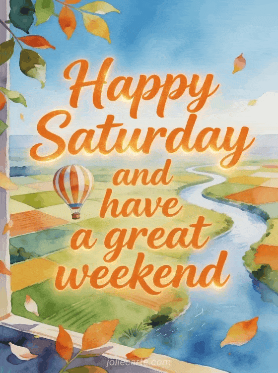 Share a cheerful Saturday and weekend greeting with orange script, a striped hot air balloon, patchwork fields, a winding river and a bright open sky. Discover also happy saturday and weekend image, happy Saturday flowers images or sparkling happy Saturday images.