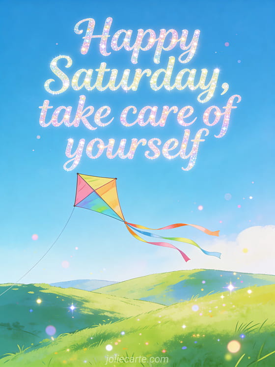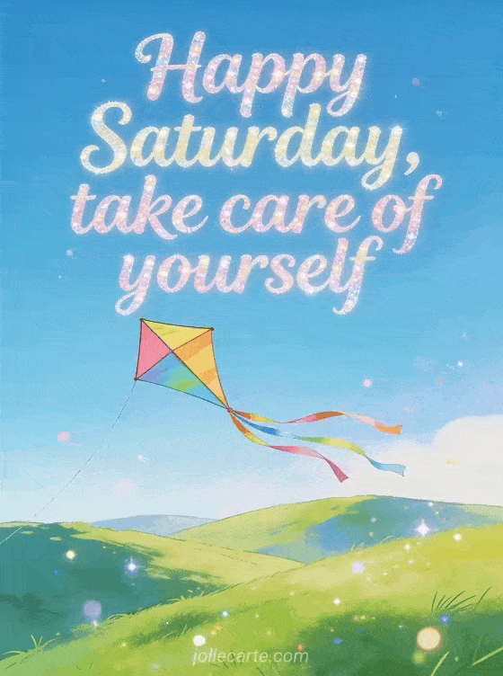 Send a warm happy Saturday greeting with playful hand-lettered script, gentle glitter, a clear sky, a ribbon kite dancing above rolling green hills and twinkling light particles. You may also like this free virtual happy saturday card, this good morning saturday image or this the Saturday greeting.