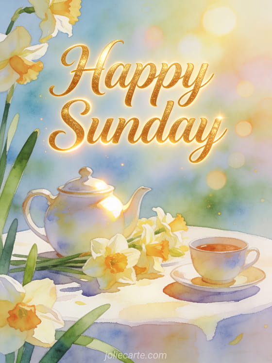 Share a cheerful Sunday breakfast scene in watercolor with a porcelain teapot, fresh daffodils, a bright table, soft bokeh, and pastel light. Discover also happy Sunday images, happy Sunday animated image, or happy Sunday friends gif.