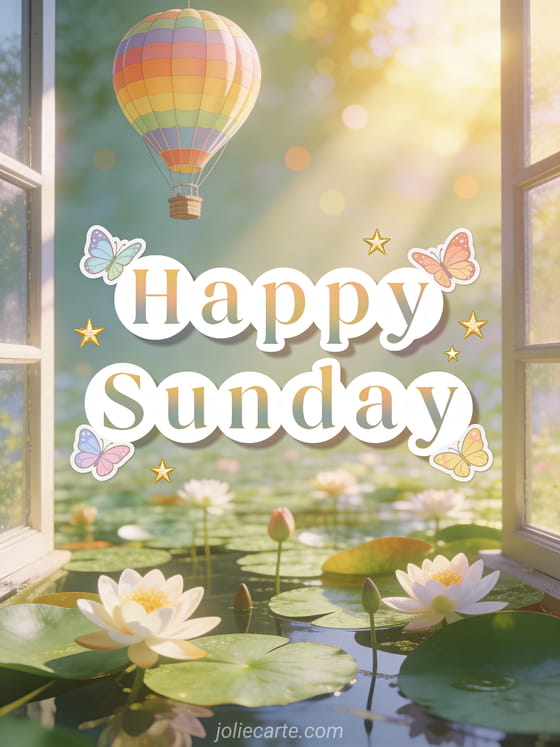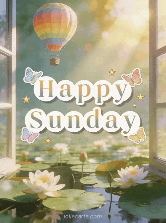 Send a poetic happy Sunday card with white rounded lettering, colorful butterflies, golden stars and a hot air balloon floating above blooming water lilies. Discover also hello and happy sunday, happy Sunday gifs or have a good day happy sunday.
