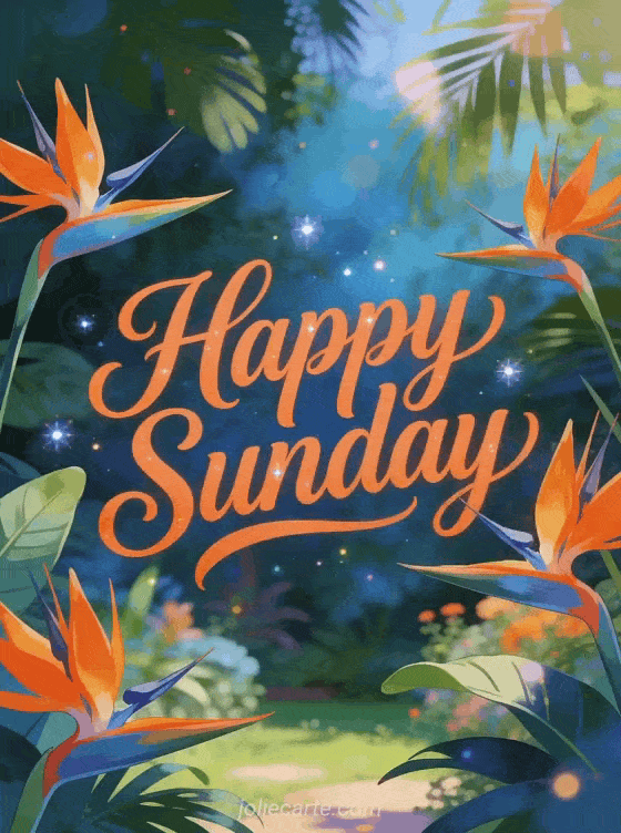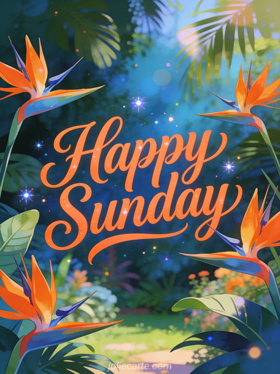 Share free happy Sunday images with vibrant coral lettering, beautiful tropical bird of paradise flowers, lush green foliage and striking orange and blue colors in an exotic garden. Discover also beautiful sunday good morning image or happy sunday big kisses gif.