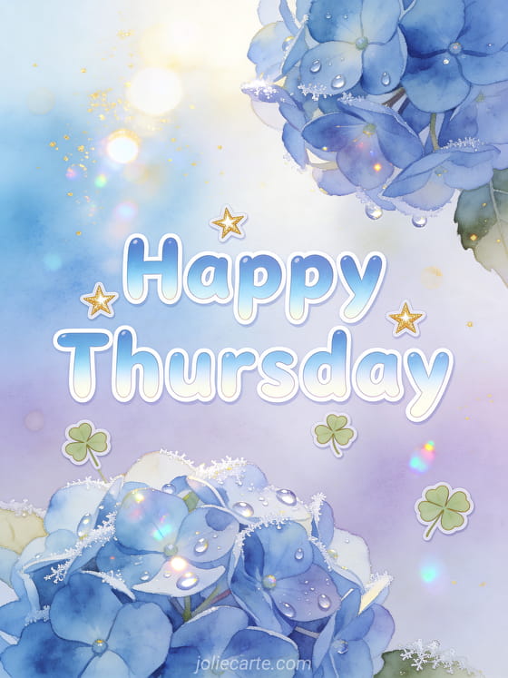 Send a gentle happy Thursday with blue hydrangeas, sparkling dew, delicate frost and a soft lavender pastel background. Discover also a wish a happy Thursday image, have a good day thursday or happy thursday cat.