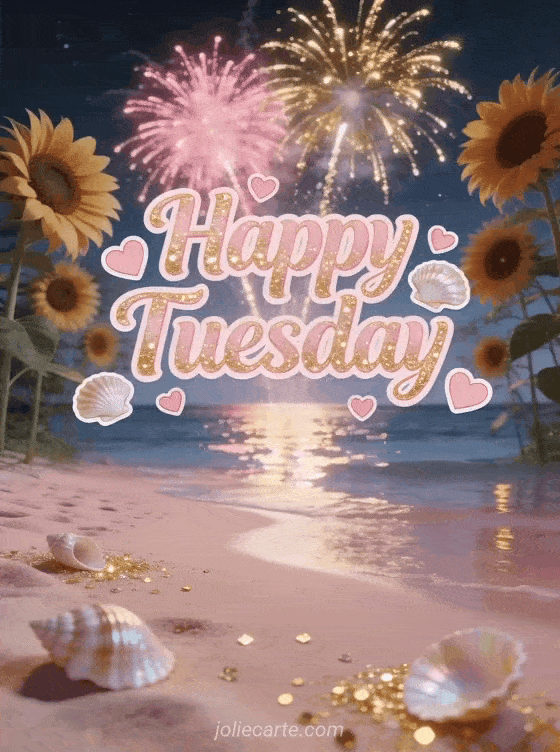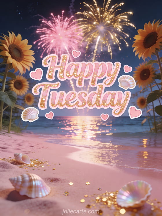 Send a free happy Tuesday kisses image with pastel pink letters, seashells, hearts and golden fireworks over a calm pink beach. Share a tender weekday wish and discover also zen tenderness positive quote happy Tuesday, have a happy Tuesday or happy tuesday and have a good day gif.