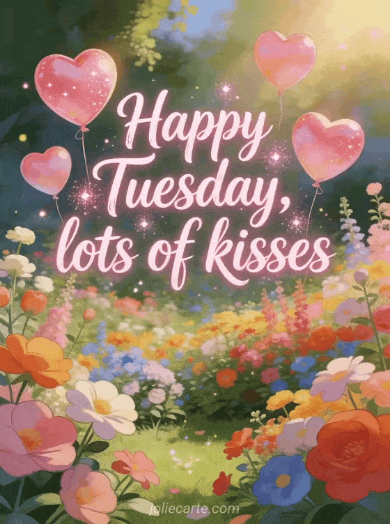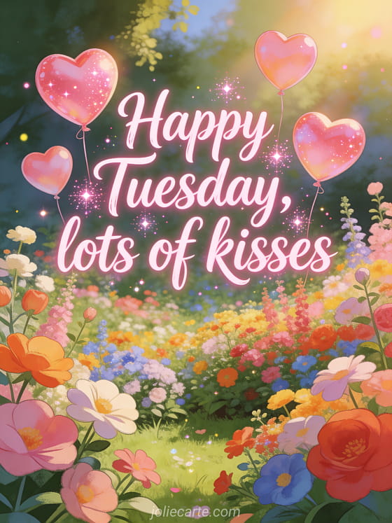 Send a tender happy Tuesday greeting with rounded pink sparkling calligraphy, heart balloons floating above a bright colorful garden, warm glow and light glitter. You may also like this happy Tuesday kisses image, this happy tuesday humor image or this virtual happy tuesday card.