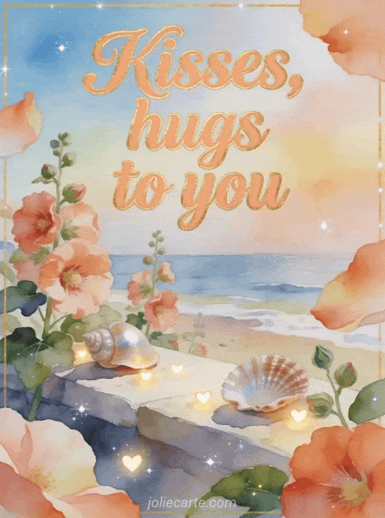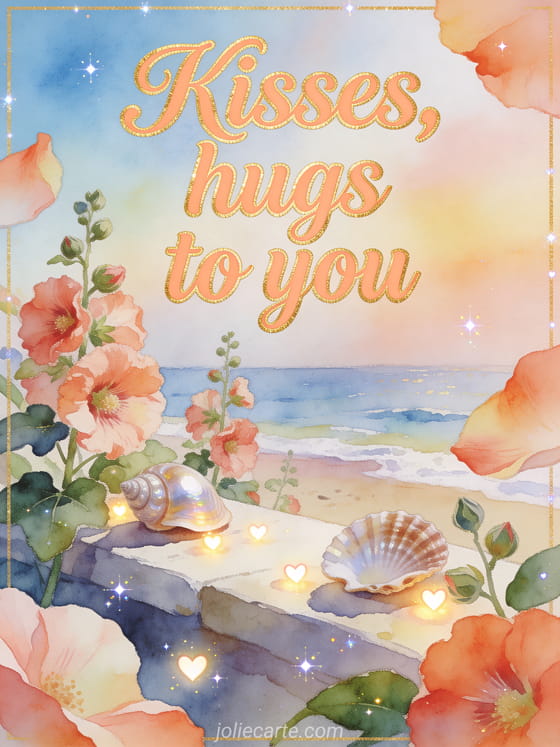 Share a warm watercolor card with apricot calligraphy, a seaside ledge, hollyhock petals, polished seashells, and tiny heart lights. Send more affection with lots of kisses animated gif, kisses dog gif, or lots of kisses image.