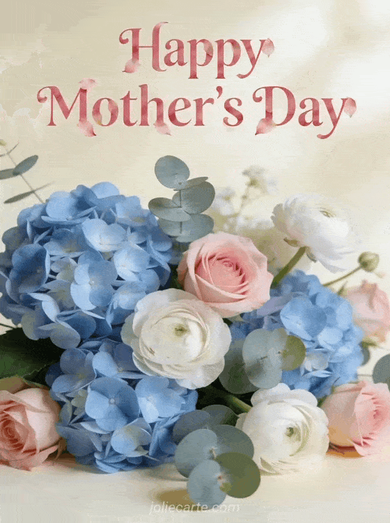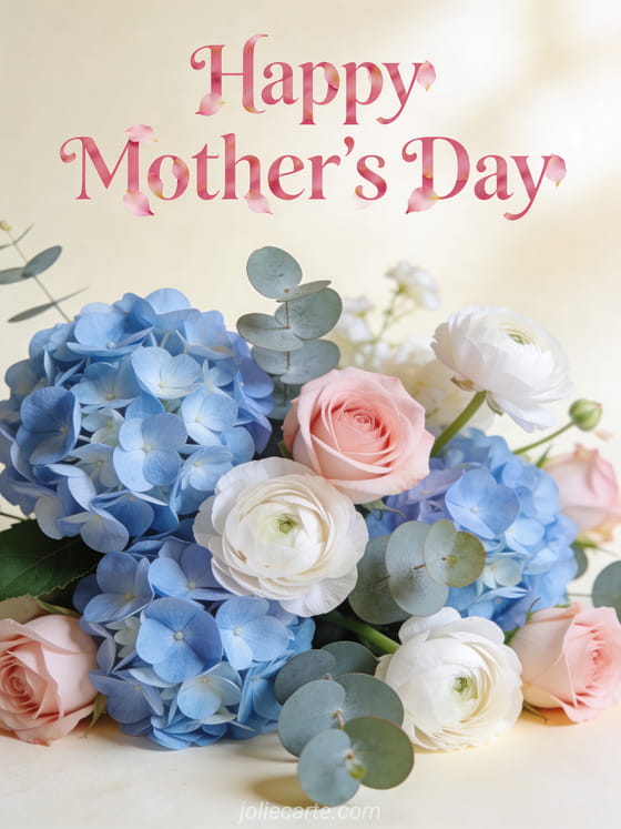 Celebrate Mom with this elegant free mother's day card featuring a lush arrangement of hydrangeas and ranunculus. Discover also mother's day images or a mother's day flower bouquet photos card.