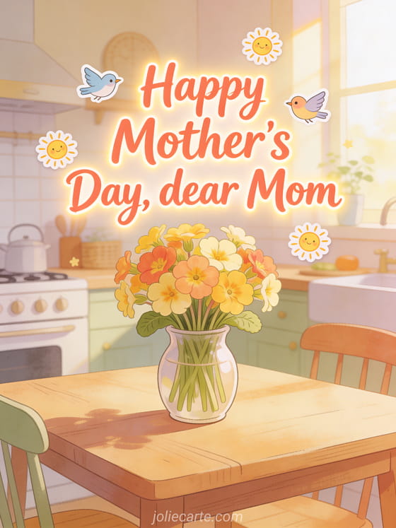 Surprise dear Mom with this charming free mother's day card featuring warm coral hand-lettering and fresh primroses in a cozy kitchen scene. Discover also a happy mother's day gif or a short poem for mother's day.