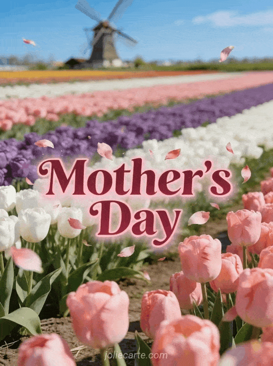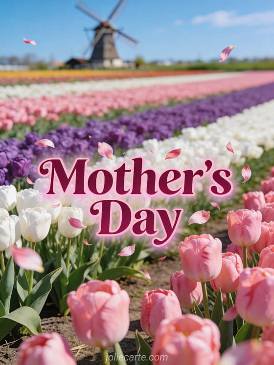 Celebrate Mother's Day with this vibrant free greeting card. A photorealistic scene features rows of pink, white and purple tulips in a Dutch garden with a windmill softly blurred in the background under a blue spring sky. Discover also a free Mother's Day card, a Mother's Day photo card or a Mother's Day flower card.