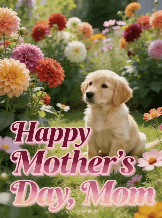 Share this joyful free mother's day card. A golden retriever puppy sits in a garden of multicolor dahlias and cosmos, looking tenderly at the camera in bright sunlight. Discover also a happy mother's day flowers card or a happy mother's day card.