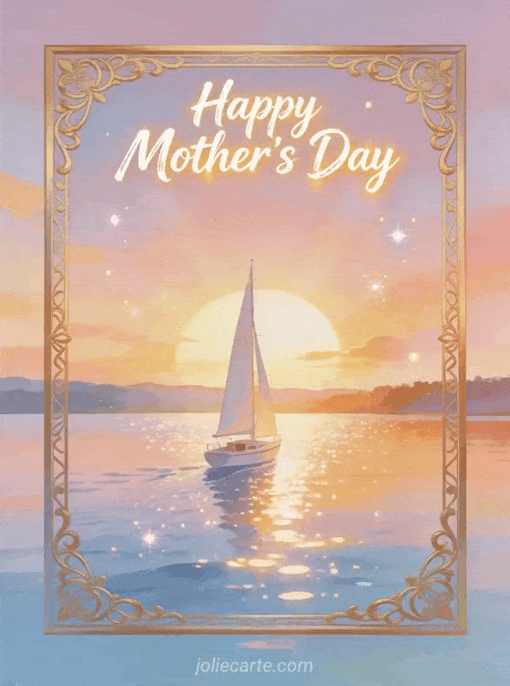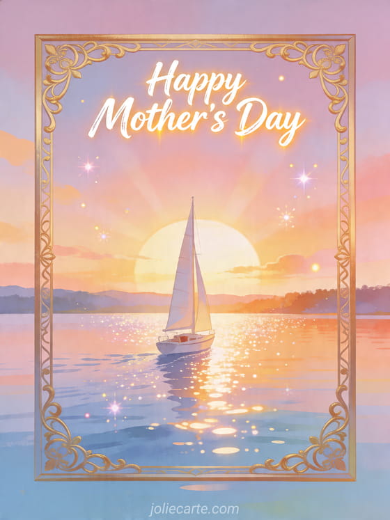 Send free Mother's Day images with an airy white greeting, a sparkling lakeside panorama, and a graceful sailboat gliding under a pastel sunrise. This serene illustrated card brings calm, light, and tenderness to the day. Discover also Mother's Day cards, heartfelt Mother's Day message, or Mother's Day heart card.