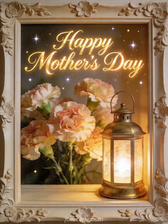 Send free Mother's Day pictures with elegant champagne calligraphy, a warm glow, and a photorealistic brass lantern beside fresh carnations inside a decorative frame. Golden light and tiny sparkles make this card inviting and festive. Discover also a poem for Mother's Day, Happy Mother's Day messages, or images for Mother's Day.