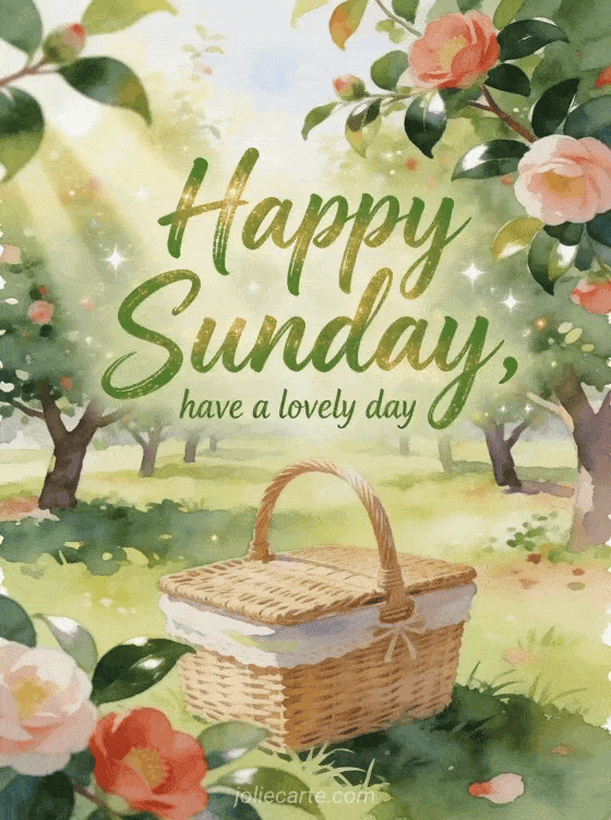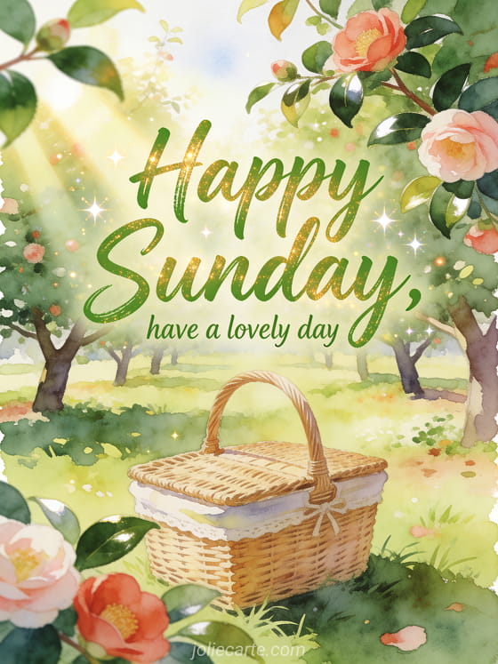 Send a cheerful Sunday greeting filled with fresh green lettering, golden light and a picnic basket in a sunny orchard. This free card brings a warm wish for a lovely day, with camellias and glossy leaves adding a festive garden touch. Discover also a winter happy sunday image card, a nice sunday card or a happy sunday message card.