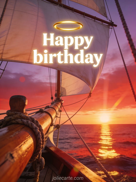Send a stunning birthday card with a magnificent ocean sunset viewed from the deck of a wooden sailboat, white sails deployed against a blazing sky of red, orange and violet. Discover also a funny birthday gif for a man or birthday card man sports car.