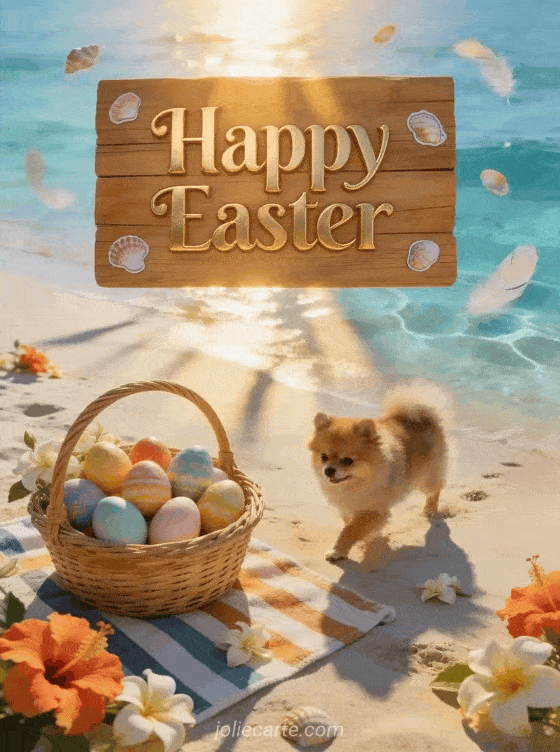 Send this beautiful free virtual Easter card featuring a sunny beach at golden hour, a Pomeranian playing in the sand beside a basket of colorful Easter eggs. Hibiscus and jasmine flowers add a tropical touch to this warm celebration. Discover also a Happy Easter holidays card, a virtual Easter card or an Easter card text.
