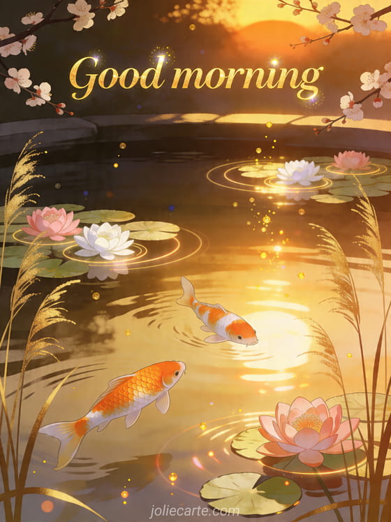 Share a serene good morning greeting with a zen pond, glowing koi carp and blooming water lilies at sunset. Discover also virtual good morning card, good morning november images and hello mom.