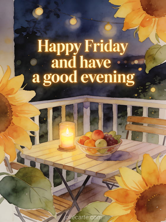 Share a happy end-of-day message with sunflower petals, a cozy patio table, a glowing candle, a ripe fruit bowl, and warm evening lights in watercolor. Discover also a happy Friday and good weekend image, happy Friday cards, or a text to wish a happy Friday.