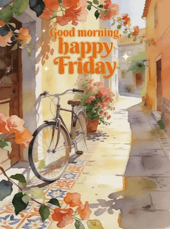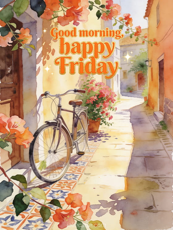 Share a sunny good morning and happy Friday message with a vintage bicycle, blooming bougainvillea and a bright village lane. Discover also a happy friday kisses gif, wishing a blessed Muslim Friday images or images wishing a happy Friday.