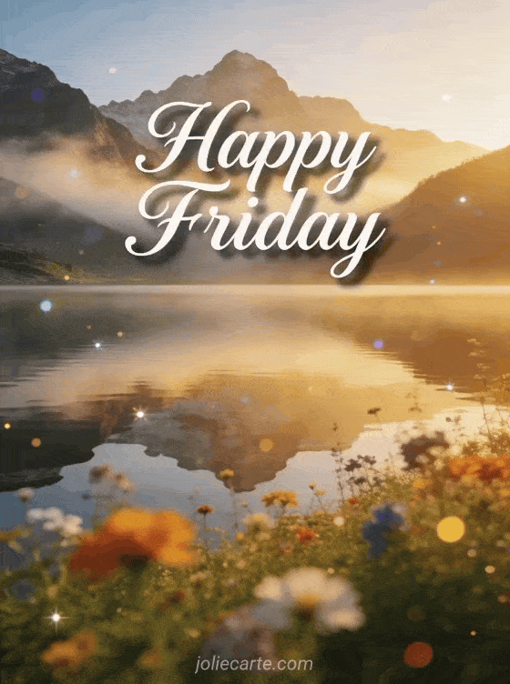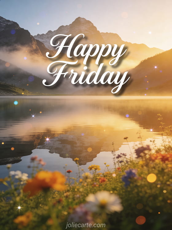 Share a peaceful happy Friday quote with a serene mountain lake at sunrise, mirror reflections, wildflowers and misty peaks. Discover also free happy friday images, a message to wish happy friday or happy friday big kisses.