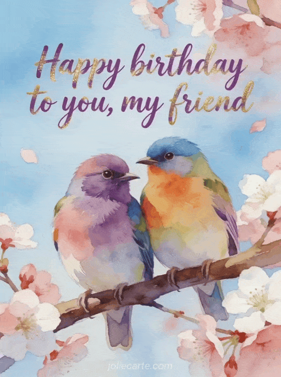 Share this spring birthday card with two colorful birds on a blooming cherry branch and a warm friendship message. You can also browse rose for birthday woman, free happy birthday woman image, and gif humor birthday woman.