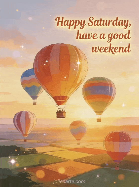 Share a warm happy Saturday and good weekend greeting with colorful hot air balloons floating over countryside and patchwork fields at sunrise. Discover also good morning happy saturday kisses, landscape happy Saturday landscape or funny happy saturday.