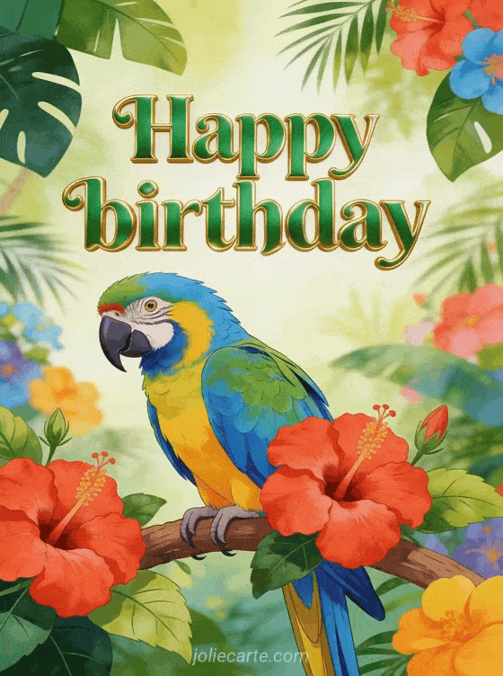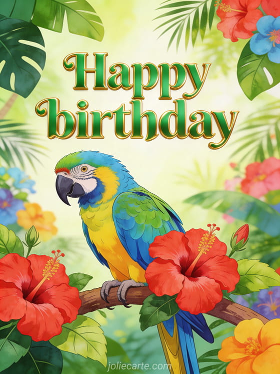 Send a vibrant birthday card featuring a colorful macaw parrot perched on a tropical branch with hibiscus flowers. Discover also a birthday words for her or a happy birthday woman message.