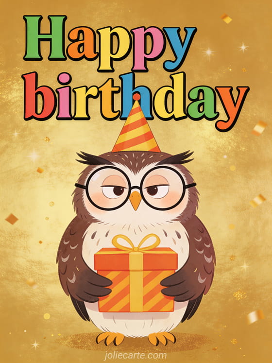 Send a humorous birthday card featuring a barn owl with big round glasses and a party hat, holding a wrapped gift. Discover also a birthday message for women or an elegant birthday card for women.