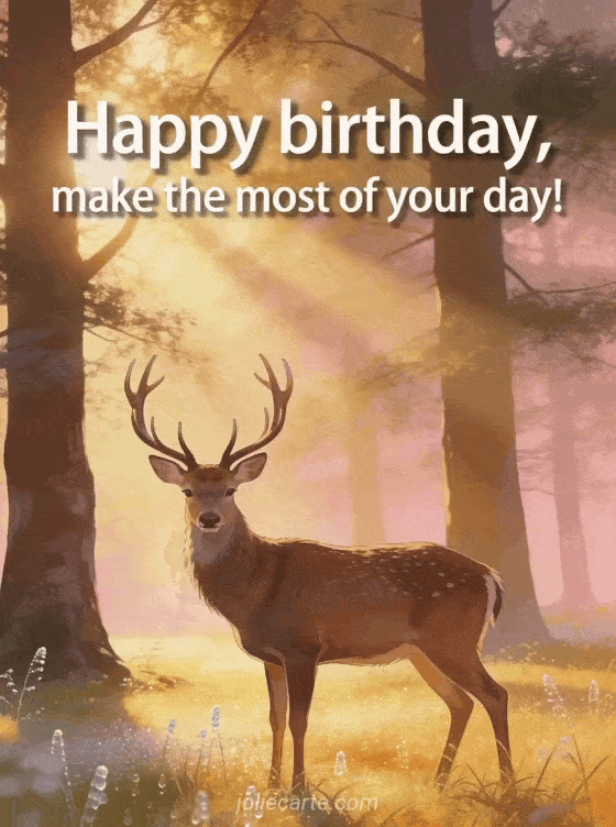 Send this magnificent birthday gif featuring a majestic deer with impressive antlers in a dew-covered clearing at sunrise, with light rays filtering through the trees. A free photorealistic birthday card with a serene and majestic atmosphere. Discover also birthday card man sports car or birthday wishes for men.
