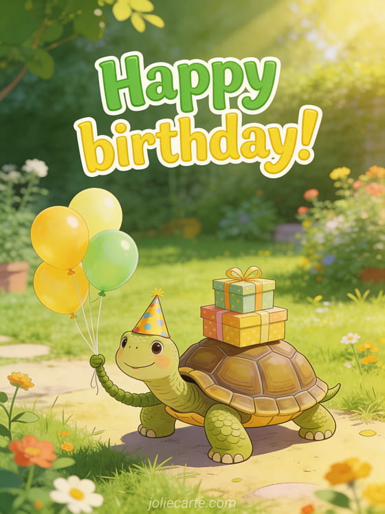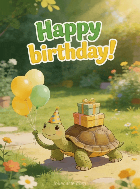 Make her laugh with this funny birthday gif featuring an adorable turtle with a party hat carrying a pile of colorful gifts. Discover also a happy birthday card dear friend or a funny happy birthday gif for women for more fun birthday greetings.