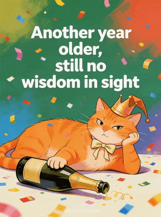 Send this funny birthday humor card for a man with a mischievous ginger cat wearing a crooked crown and a knocked-over champagne bottle, confetti everywhere. Discover also a free happy birthday card for men or a funny birthday gif for a man.