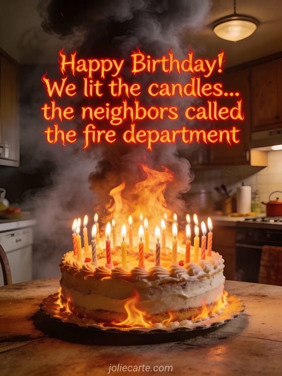 Send this funny birthday image with a cake so full of candles it looks like a campfire with smoke rising to the ceiling. Discover also a birthday humor or a funny birthday quote.