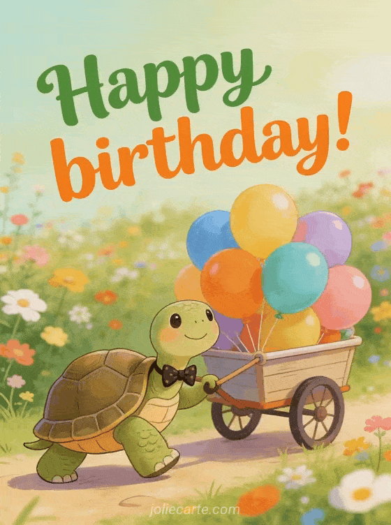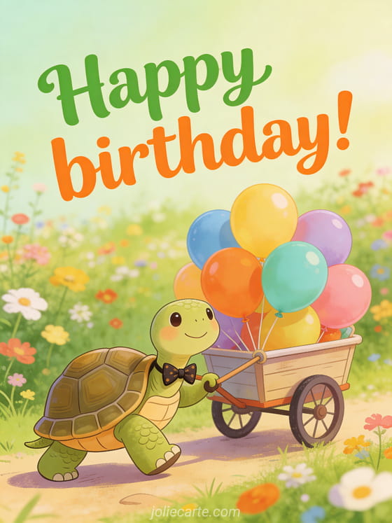 Make her smile with these funny birthday images featuring an adorable turtle in a bow tie pushing a colorful balloon cart on a sunny meadow. Discover also a birthday drawing woman or a happy birthday gif image for women for more birthday greetings.