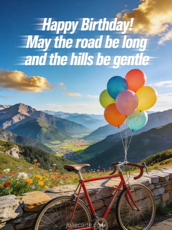 Send this funny birthday message for a cyclist with a vintage red racing bike at a spectacular mountain pass. Discover also a birthday humor card or a funny birthday quote.