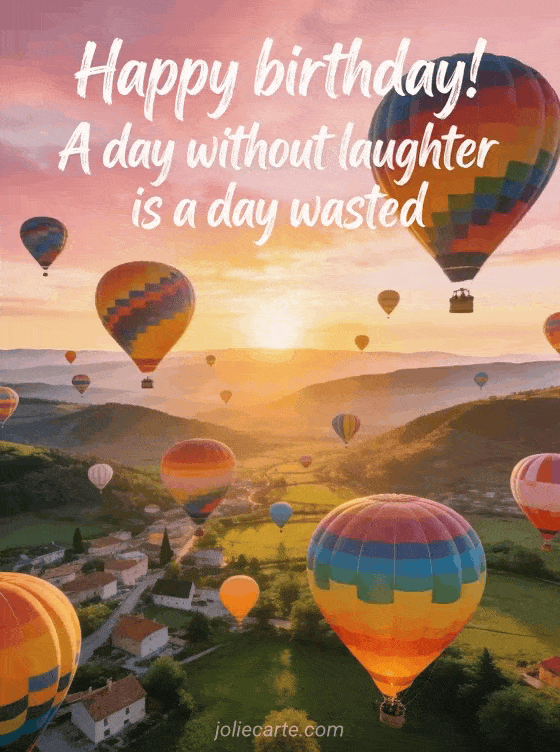 Send a cheerful happy birthday greeting to remind them that a day without laughter is a day wasted. This inspiring card celebrates life and joy with a stunning view. Discover also a funny cat happy birthday greeting, a funny birthday greeting for women or a hilarious birthday humor proverb.