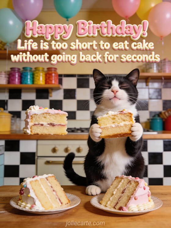 Make them laugh with this funny birthday card featuring a photorealistic black and white cat with two slices of cake. Discover also a funny birthday cat gif or a gif birthday funny.