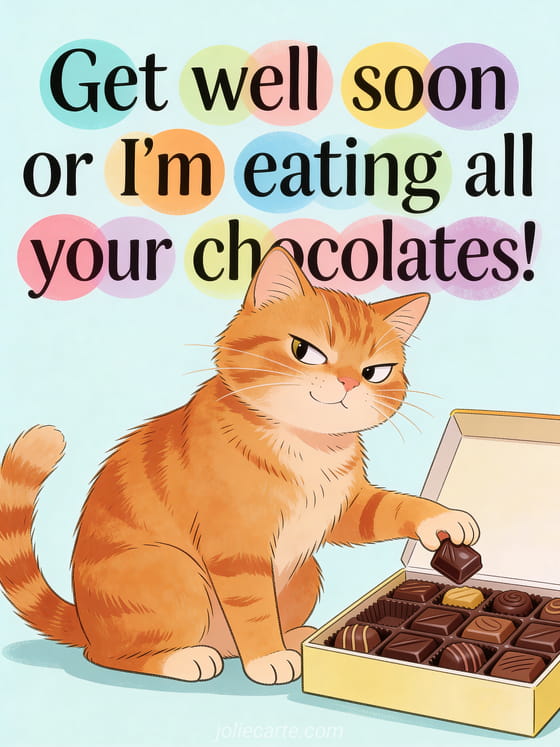 Get well soon or I'm eating all your chocolates! a hilarious get well message with a cheeky cat