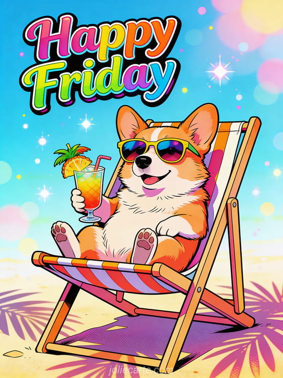 Share a cheerful Friday laugh with a funny corgi wearing oversized sunglasses in a beach chair with a tropical drink and palm shadows. Discover also a Friday kisses image, a friday kisses card or a cyber happy Friday card.