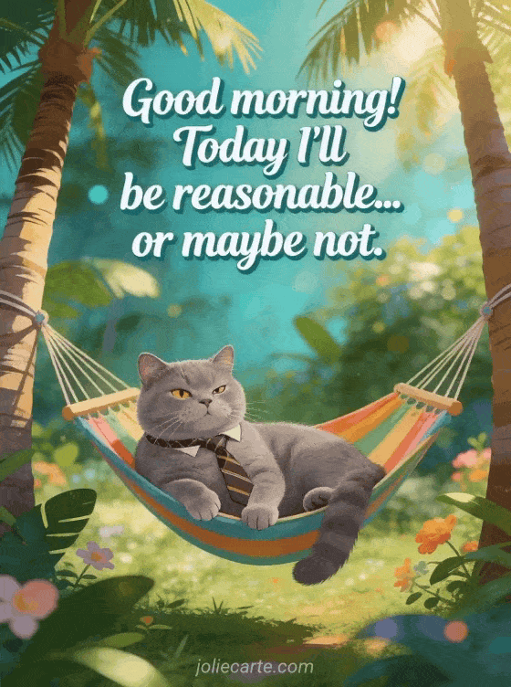 Enjoy this funny good morning gif with a laid-back British Shorthair cat in a tropical hammock. Also check out a funny romantic good morning text or a funny animated good morning gifs.