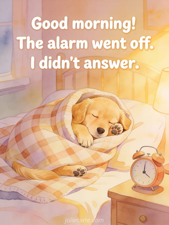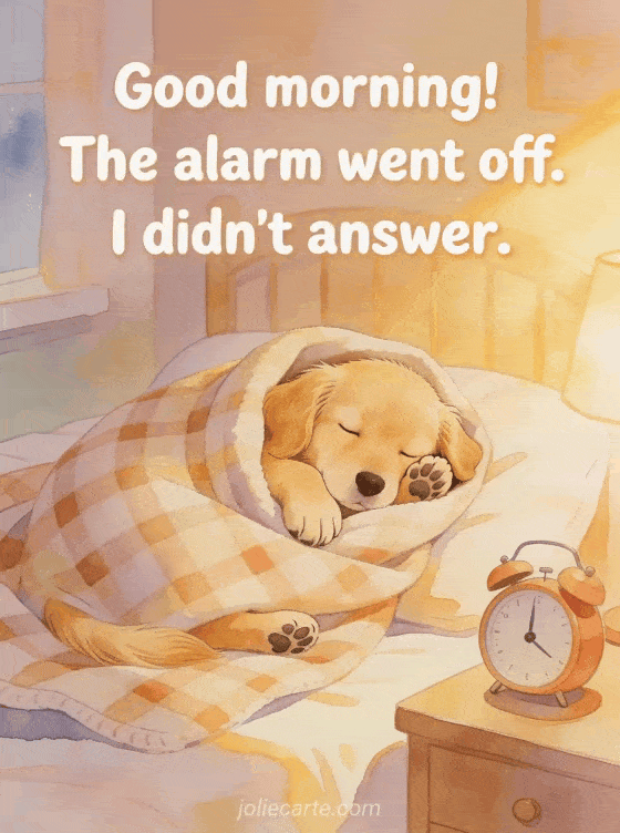 Brighten someone's morning with this funny good morning image of a golden retriever ignoring the alarm. Also check out a funny good morning image my love or a gif good morning humor.
