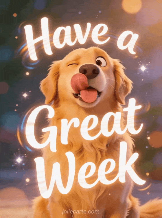 Send a funny good week animated gif and make someone burst out laughing. A derpy golden retriever with tongue out and the most goofy face is the perfect hilarious week wish. Discover also a beautiful day and good week card or a good week flowers card.