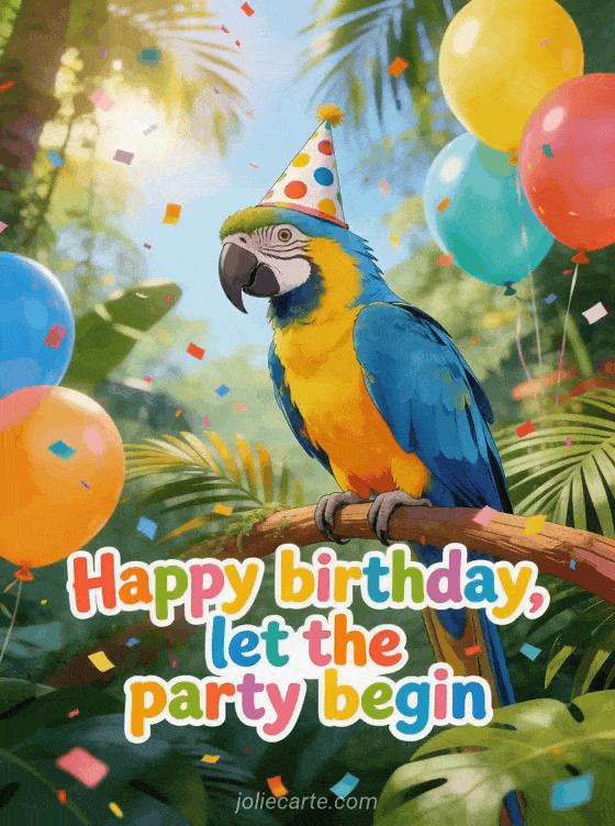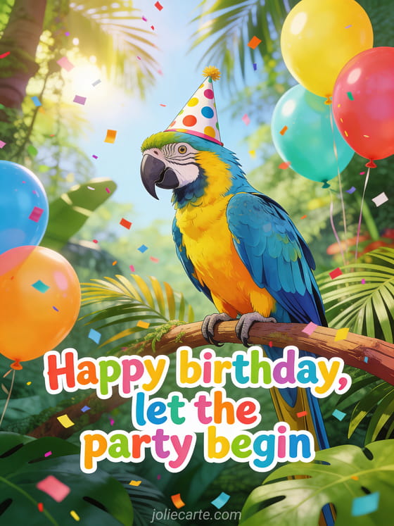 This fun birthday card for men features a flamboyant blue and yellow macaw parrot perched on a tropical branch, wearing a polka-dot party hat, surrounded by colorful balloons in a lush jungle. The perfect card to make any man laugh on his special day. Discover also a beautiful free birthday card for men or a birthday card text for him.