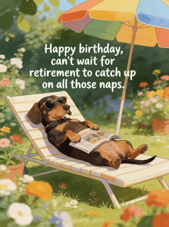 This funny birthday gif for men features an adorable dachshund fully stretched out in a garden deck chair wearing sunglasses, with a magazine on his belly, surrounded by flowers and a colorful parasol. The perfect humorous card to make any man laugh on his birthday. Discover also a beautiful animated birthday card for men free or a funny happy birthday for men.