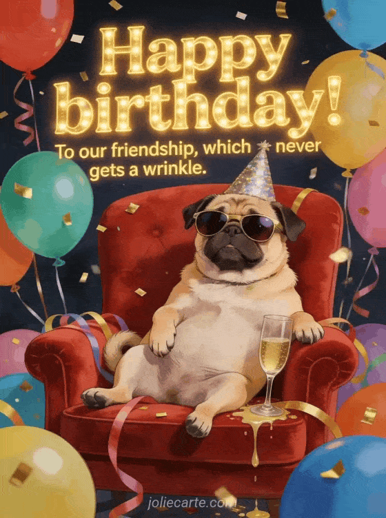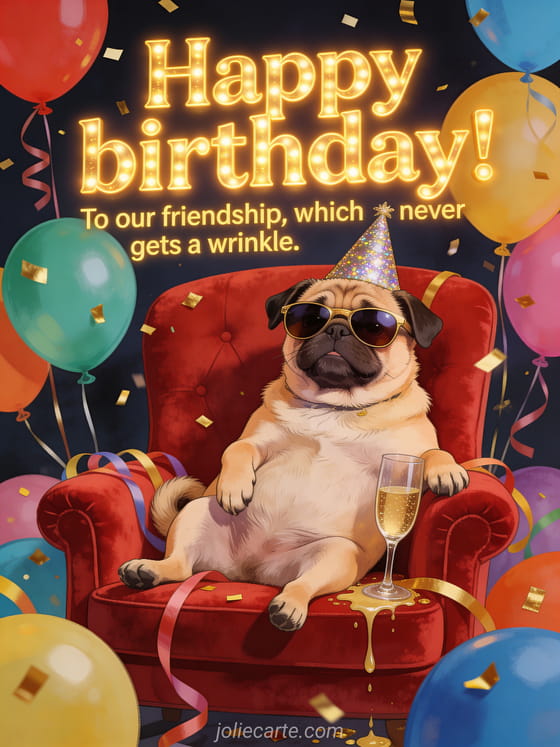 Send this hilarious friendship birthday card with an adorable pug wearing oversized sunglasses and a glittery party hat, sitting on a red velvet armchair surrounded by balloons and confetti. Discover also a birthday message for a friend or a happy birthday card for a friend.